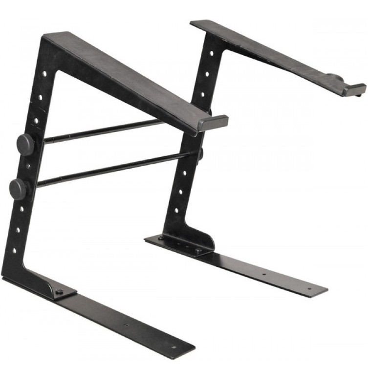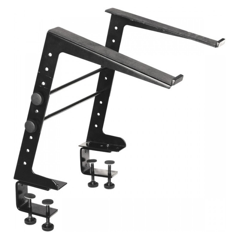 Supporto ideale per laptop realizzato in acciaio verniciato nero. Offre la regolazione in altezza e larghezza, è provvisto di due clamps per il motaggio su flight case o tavolo e include delle staffe per l'utilizzo in appoggio sulla base della consolle o del piano di lavoro.